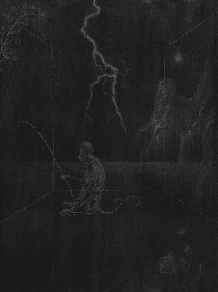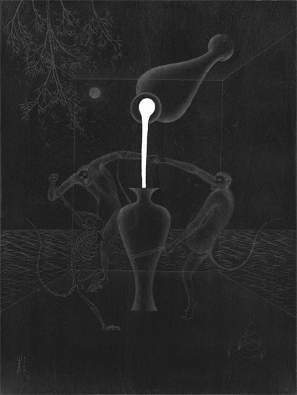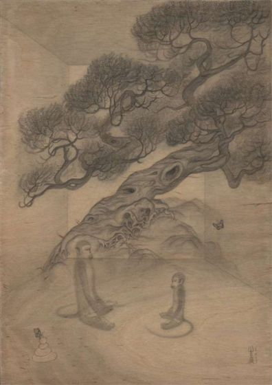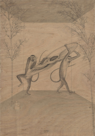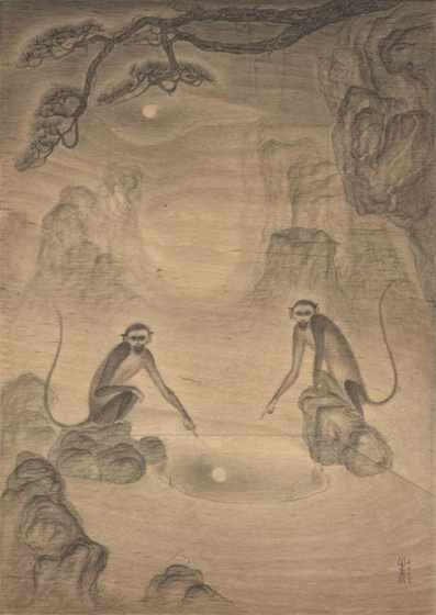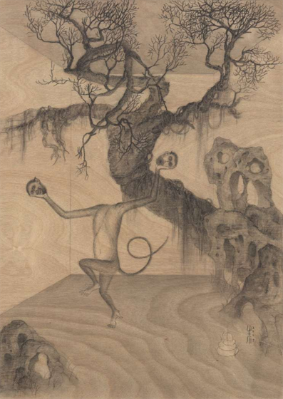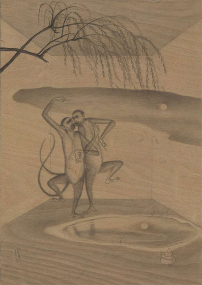 对“二”的疑情继续延展出了“双猴系列”,它也是继承国画传统,尤其是禅画中的猿图类型。古人画猿有类比佛教中将人的心念比喻成心猿,指出其非常活跃的特质。我开始更具像化地处理木纹,不同画板上的木纹幻化出日月山河天空云雾。我将两只猴子安放在其中,它们像是在演戏,演出生死轮回,半梦半醒的戏。因为经常画到月亮,我尝试将木板刷成黑色来呈现夜晚。铅笔在黑色的画板上反而呈现了银色亮光,我有点惊喜地发现原来银是夜之光,所以金是昼之光。我在等待金色的到来。