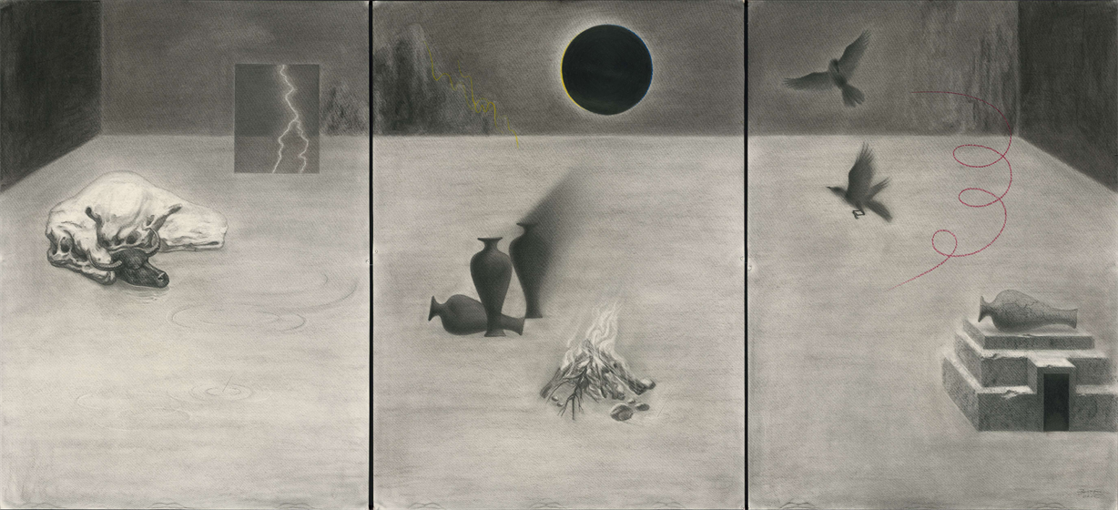说到这有必要谈谈,为什么我坚持用铅笔作为主要的绘画媒介。其原因有几点,一是疫情后我的创作更多转向线下的物质性,身体性的能量,这也是为什么我开始尝试做行为剧场。二是铅笔石墨这种材料本身有一种很安静的质地。它有一种细微的重量感,是下落的,安定的。同时它的笔触细腻,可以很敏感地传达精微的觉受。由于笔头很小,又需要颇多的身体劳作,并伴随着手在画面上的揉搓抹擦等动作。对我来说,它是一个非常简单却可以直接又敏锐地传递身体性能量的工具。因此,绘画的过程对我来说是心念和能量的投射和注入。