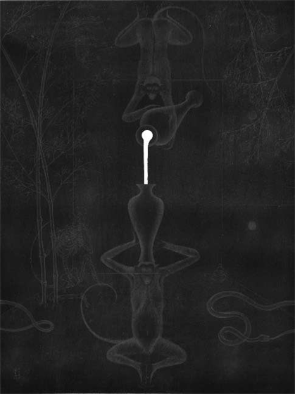 目前为止猴子系列的画还在进行中,有许多是与死亡相关的,但并非呈现出一种死亡的恐惧感和消极性,而更像是一场游戏,大概是轮回的游戏。释迦牟尼讲睡眠是小昏沉,死亡是大昏沉,意思是还会再醒来,意识是不灭的,但身体会流变。我想双瓶在之后的绘画中还会幻化出更多的角色,例如双牛、双象、双鸟、双蝶、双树、双花等等,一切都在流变。