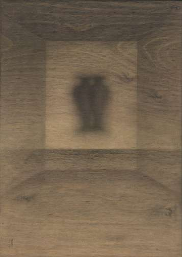 于是我开始尝试在木板上作画。在小尺寸的木板上画一个空间和两个瓶子,我尝试不断地摆放两个瓶子在空间中的位置,这些位置变化会引发细微的不同觉受,但它们的基调都是安静的。而木纹恰好是流动的,自然地呈现了混沌流变的氛围,我通过描摹木纹将这些“气流”、刻意地显现出来——这有点像当初陈在梦和我的合作,我也在跟木纹合作。每次我拿到一块板子,会先去体会这个木纹给我带来的感受,它会启发我如何摆设这两只瓶子。这个系列的名字叫“不知身是谁”,这其中有一种疑情,是一个还是两个,自我与他者,自我与自我觉照。我希望将这种疑情[2]反射给观众。