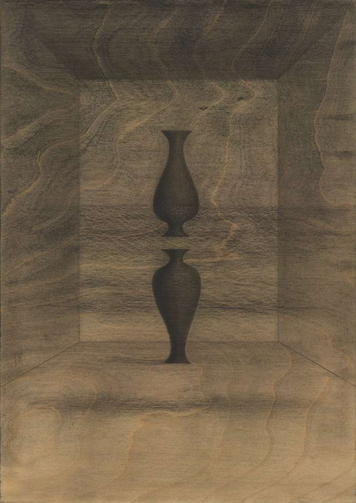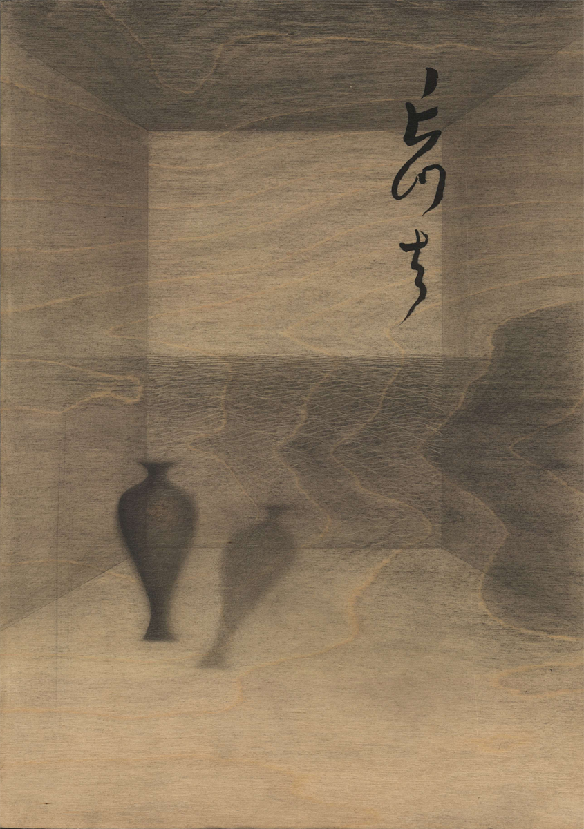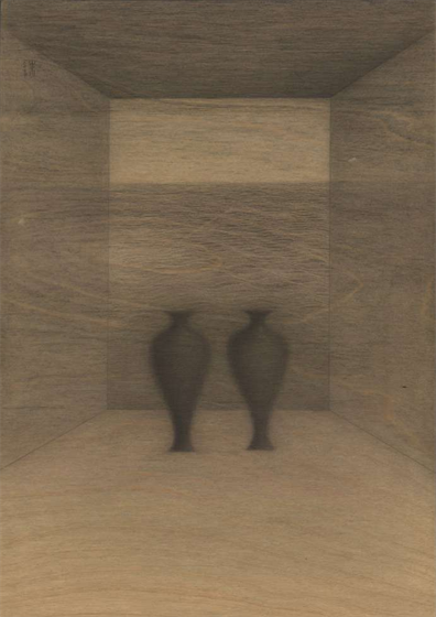 于是我开始尝试在木板上作画。在小尺寸的木板上画一个空间和两个瓶子,我尝试不断地摆放两个瓶子在空间中的位置,这些位置变化会引发细微的不同觉受,但它们的基调都是安静的。而木纹恰好是流动的,自然地呈现了混沌流变的氛围,我通过描摹木纹将这些“气流”、刻意地显现出来——这有点像当初陈在梦和我的合作,我也在跟木纹合作。每次我拿到一块板子,会先去体会这个木纹给我带来的感受,它会启发我如何摆设这两只瓶子。这个系列的名字叫“不知身是谁”,这其中有一种疑情,是一个还是两个,自我与他者,自我与自我觉照。我希望将这种疑情[2]反射给观众。