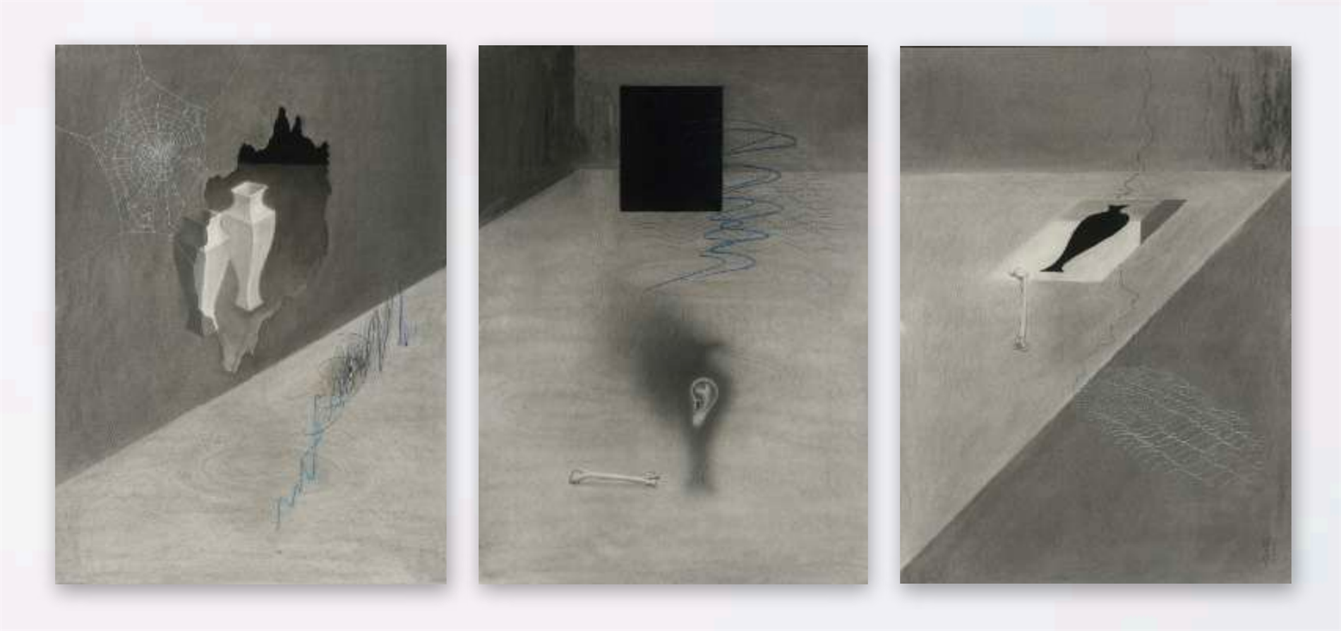 说到这有必要谈谈,为什么我坚持用铅笔作为主要的绘画媒介。其原因有几点,一是疫情后我的创作更多转向线下的物质性,身体性的能量,这也是为什么我开始尝试做行为剧场。二是铅笔石墨这种材料本身有一种很安静的质地。它有一种细微的重量感,是下落的,安定的。同时它的笔触细腻,可以很敏感地传达精微的觉受。由于笔头很小,又需要颇多的身体劳作,并伴随着手在画面上的揉搓抹擦等动作。对我来说,它是一个非常简单却可以直接又敏锐地传递身体性能量的工具。因此,绘画的过程对我来说是心念和能量的投射和注入。
