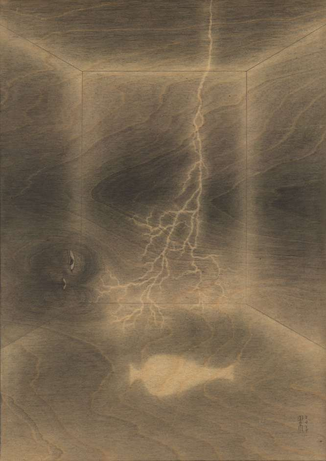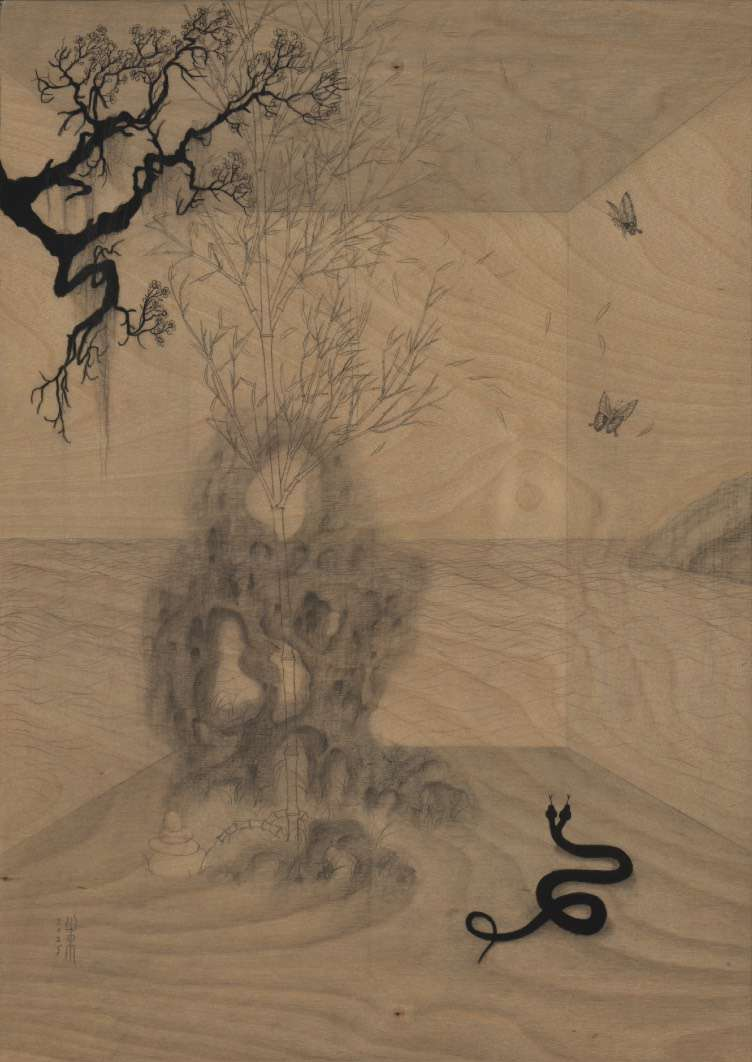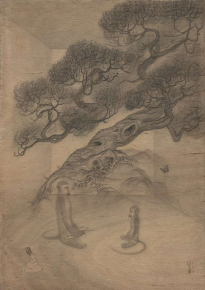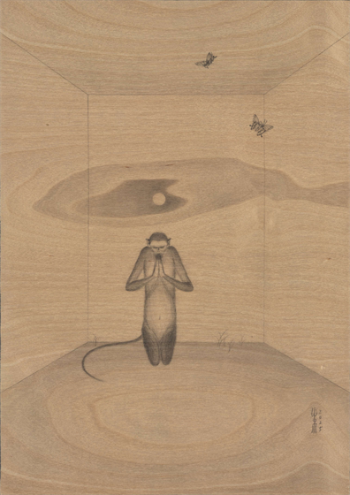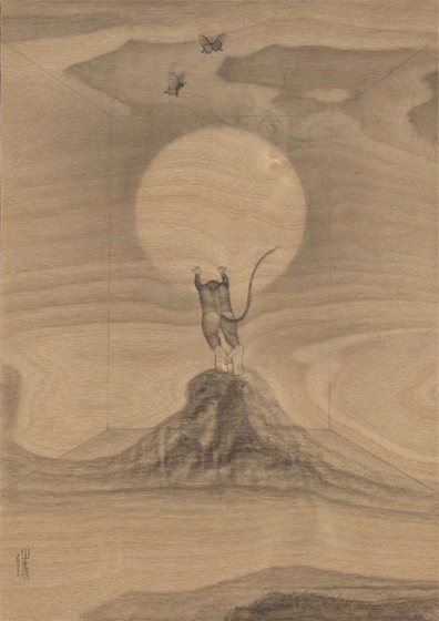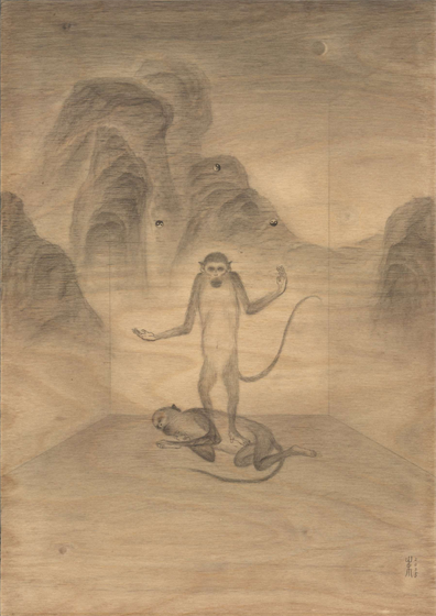 对“二”的疑情继续延展出了“双猴系列”,它也是继承国画传统,尤其是禅画中的猿图类型。古人画猿有类比佛教中将人的心念比喻成心猿,指出其非常活跃的特质。我开始更具像化地处理木纹,不同画板上的木纹幻化出日月山河天空云雾。我将两只猴子安放在其中,它们像是在演戏,演出生死轮回,半梦半醒的戏。因为经常画到月亮,我尝试将木板刷成黑色来呈现夜晚。铅笔在黑色的画板上反而呈现了银色亮光,我有点惊喜地发现原来银是夜之光,所以金是昼之光。我在等待金色的到来。