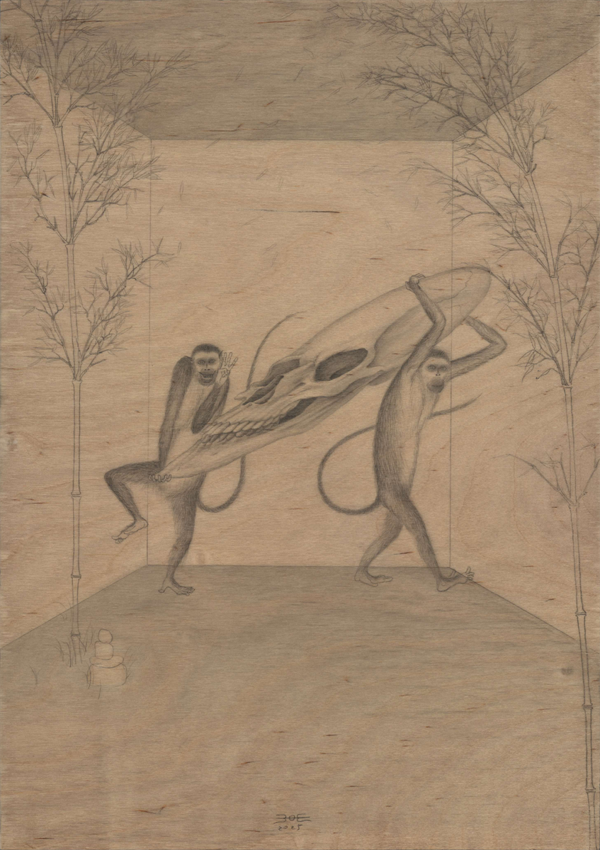 目前为止猴子系列的画还在进行中,有许多是与死亡相关的,但并非呈现出一种死亡的恐惧感和消极性,而更像是一场游戏,大概是轮回的游戏。释迦牟尼讲睡眠是小昏沉,死亡是大昏沉,意思是还会再醒来,意识是不灭的,但身体会流变。我想双瓶在之后的绘画中还会幻化出更多的角色,例如双牛、双象、双鸟、双蝶、双树、双花等等,一切都在流变。