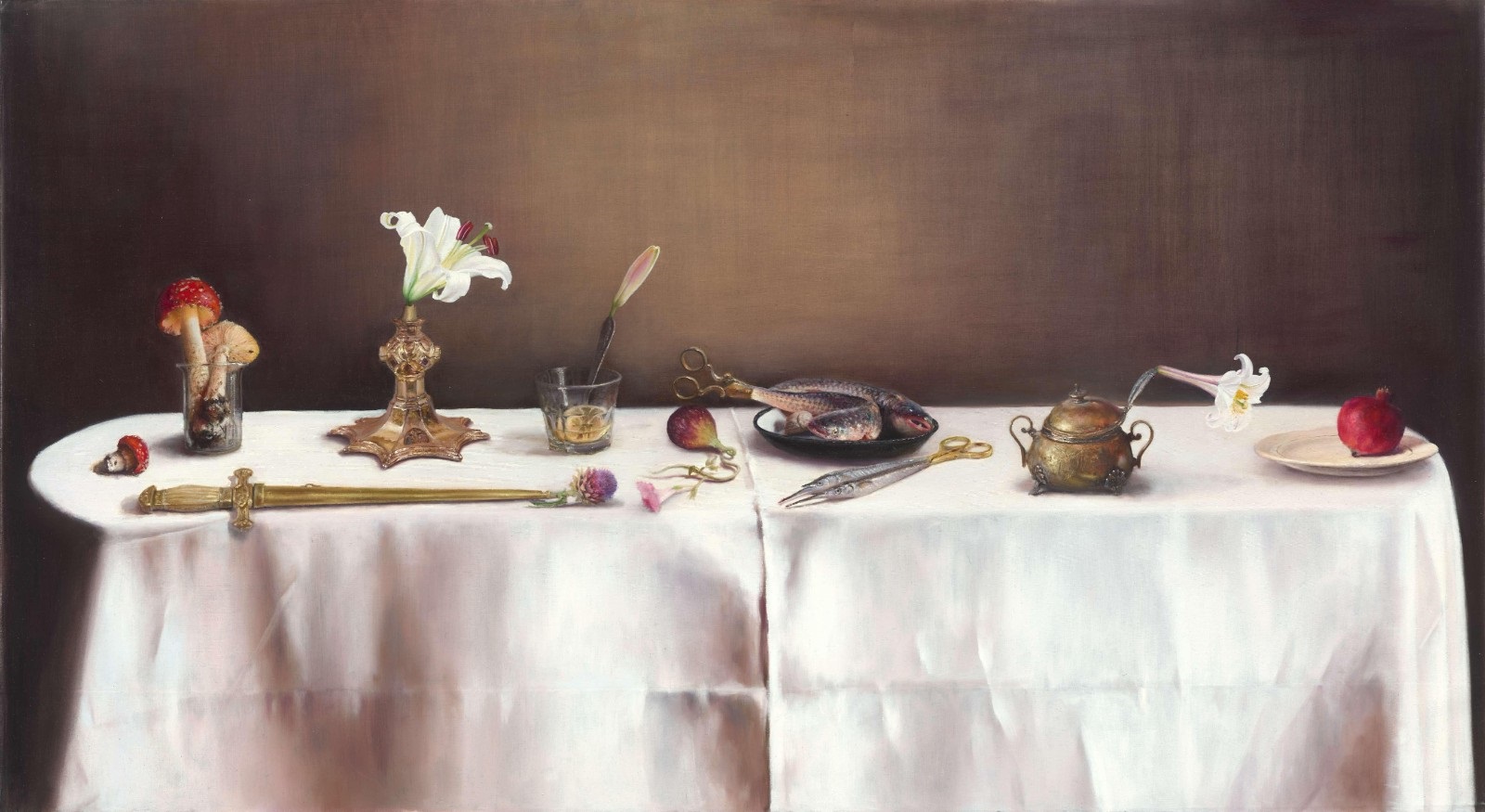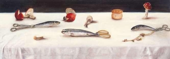 In new works, the tabletop extends beyond the horizon, becoming an entry point into a realm unreachable from reality’s edge. Somewhere beyond the visible frame, the seating is redistributed. In Axente’s paintings, white cloths and dark backgrounds elevate metallic utensils as they begin their transformation into living forms: a chalice blossoms into lilies, a spoon handle becomes a lotus bud, and the twin blades of a pair of scissors elongate into two fish.