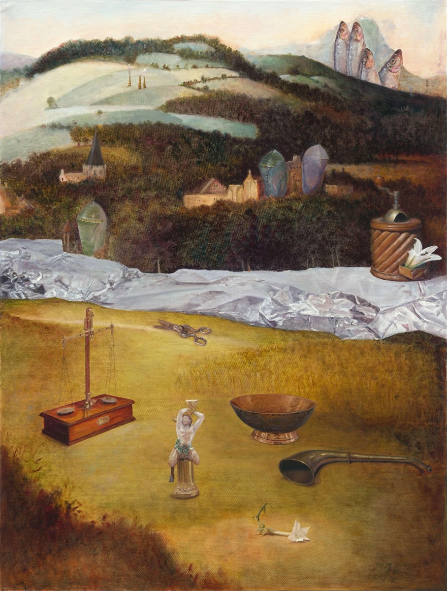 At the same time, Axente adopts elongated horizontal compositions, extending the tabletop’s line into the foreground of the landscape, like a fragment torn from a traditional scroll. Yet unlike the continuous shifting perspective of classical panoramic vision, her intent is not to construct narrative logic. Instead, she tears open a fragment of a daydream, revealing mountains, light, and objects caught in a slow state of transformation. Multiple horizons unfold across the canvas. Opposite the mountains, the water’s surface is rendered in shining metallic foil—a restless sea absorbing the anxieties and tensions of living beings. Its crumpled texture resembles a disturbed mirror reflecting the shadows of life and the outlines of desire. Within this fantastical, surreal terrain, day and night, life and death, the known and the unknown overlap endlessly, forming a perpetual state of transition.