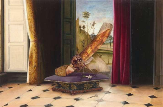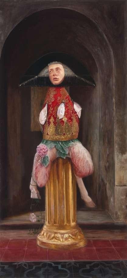 Within the paintings, transformation occurs at the table, the process of complete metamorphosis in insects becomes a new reference pathway for Axente’s visual translation. Her earlier exploration of the relationship between humans and animals shifts subtly toward the relationship between humans and insects. In works such as Eucharistic and In Pray, the figures receive spiritual nourishment through communion and prayer, advancing gradually toward a heightened state of being. This passage becomes an invisible axis extending from the tabletop. Symbols of pride and spiritual danger—poisonous mushrooms and statues occupy the foreground as warnings. Fish, lilies, and scissors correspond to taste, sight, and smell: three senses that occupy the middle and distant ground, surveying the scene and pointing toward the presence of the sacred.